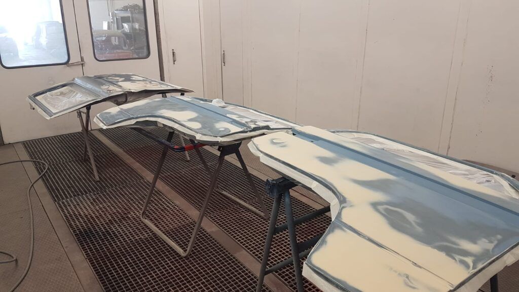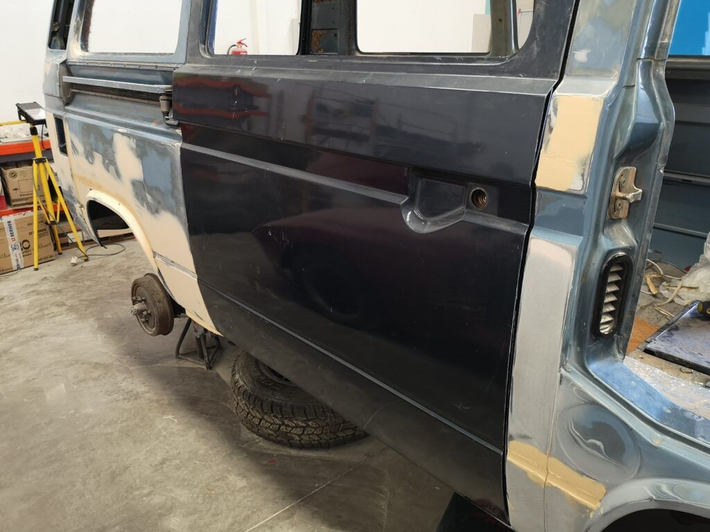 Es aquí cuando empezaron a reparar la chapa de la furgoneta. Quitar la capa de pintura mal adherida, sanear ciertos podridos y reparar con masilla algunos golpes y rasguños.