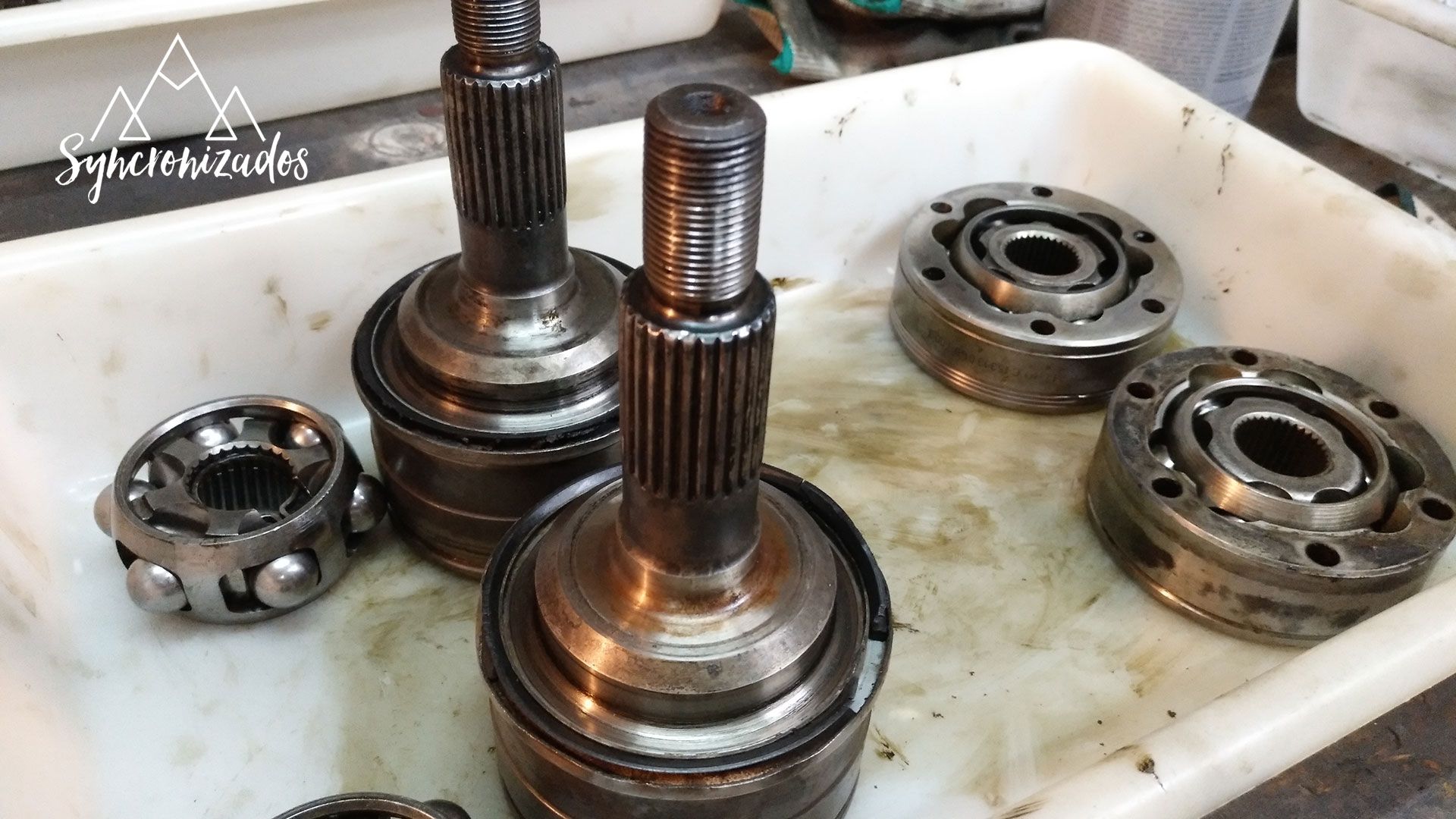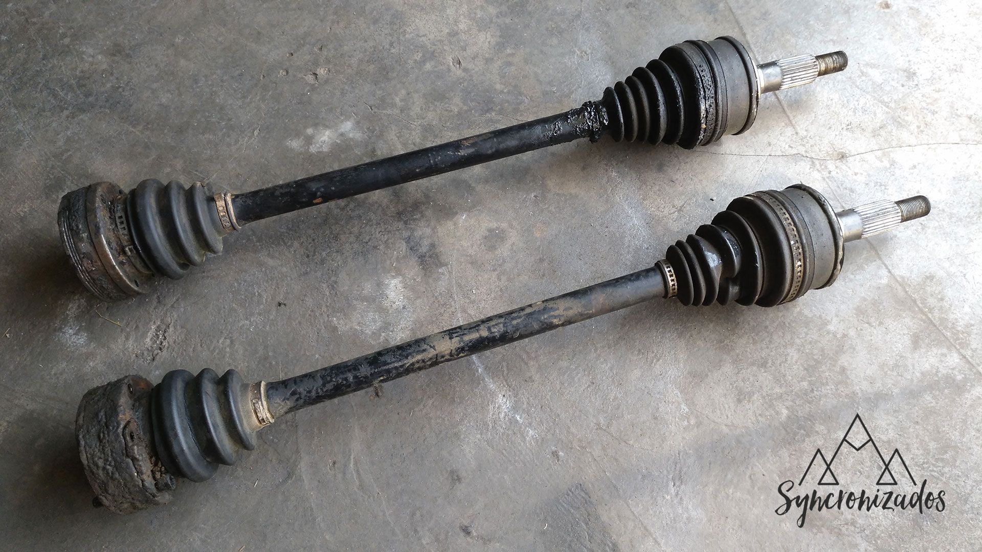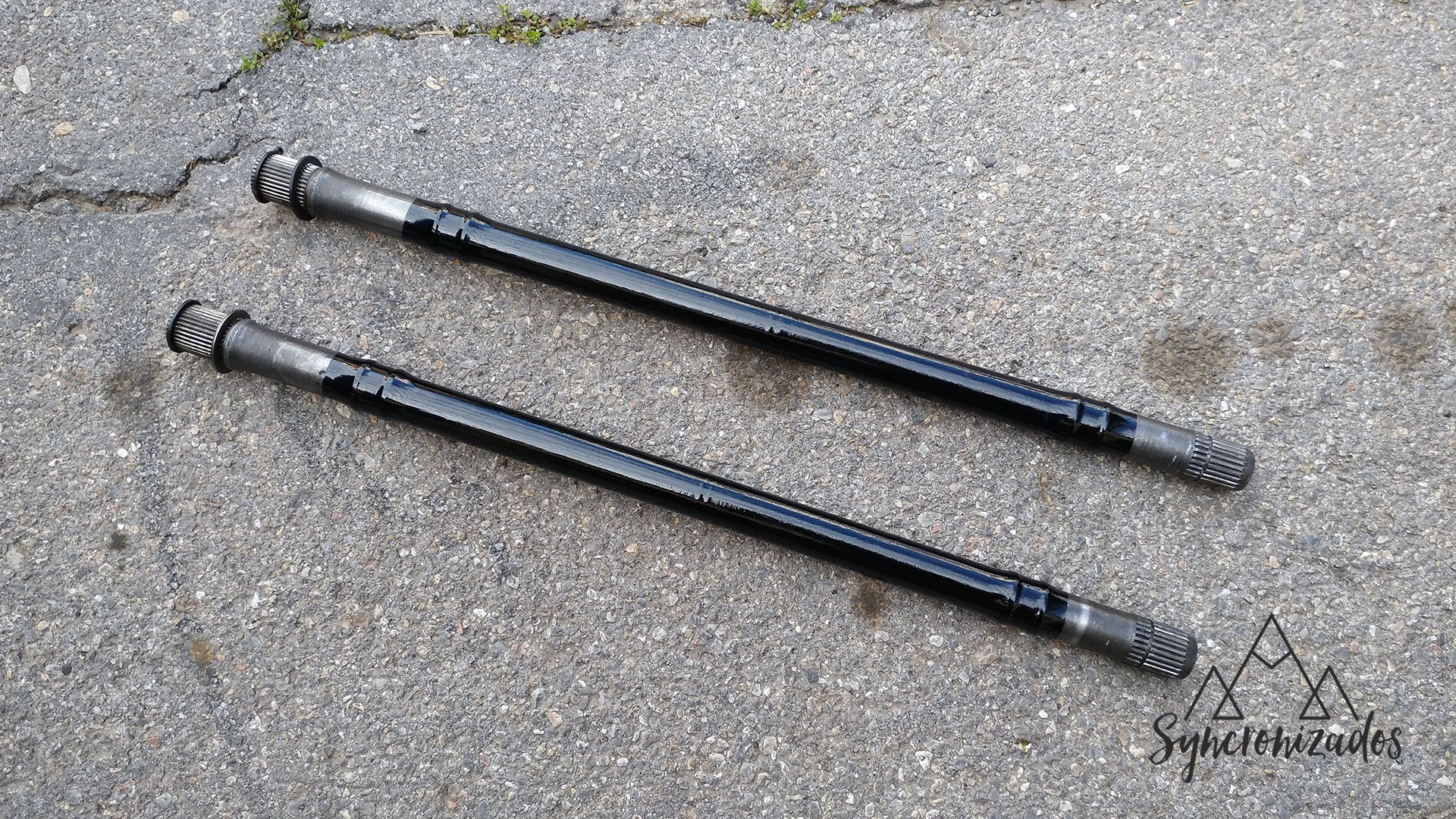 Ya que tengo el diferencial delantero de la Syncro desmontado, he aprovechado para sacar las transmisiones delanteras. El objetivo era quitarle toda la suciedad acumulada (que imposibilitaba quitar bien los tornillos), cambiar fuelles y grasa, ver el estado de las bolas, pistas, cazoletas… y aprovechar para pintar las transmisiones.