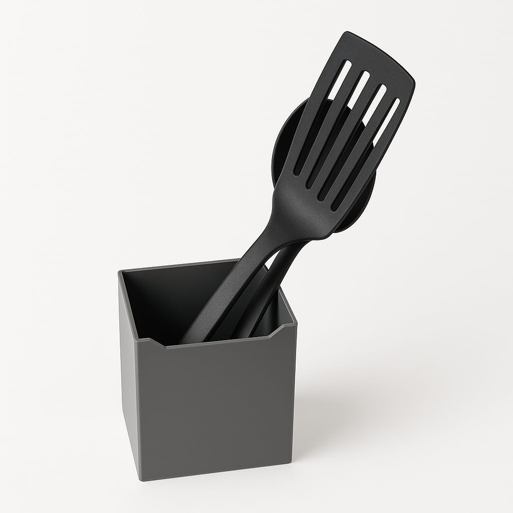 En la furgoneta siempre hay huecos “raros” dentro del armario. Este organizador está pensado para aprovecharlos y mantener los utensilios largos (espumaderas, cucharones, etc.) bien colocados. Con este producto intento solucionar no llevar los utensilios largos, que no caben en el cajón de los cubiertos, por ahí tirados. Yendo tirados cuesta encontrar y no es muy higiénico. Ahora, con este bote organizador, estos utensilios largos van todos ordenados y en un único espacio.