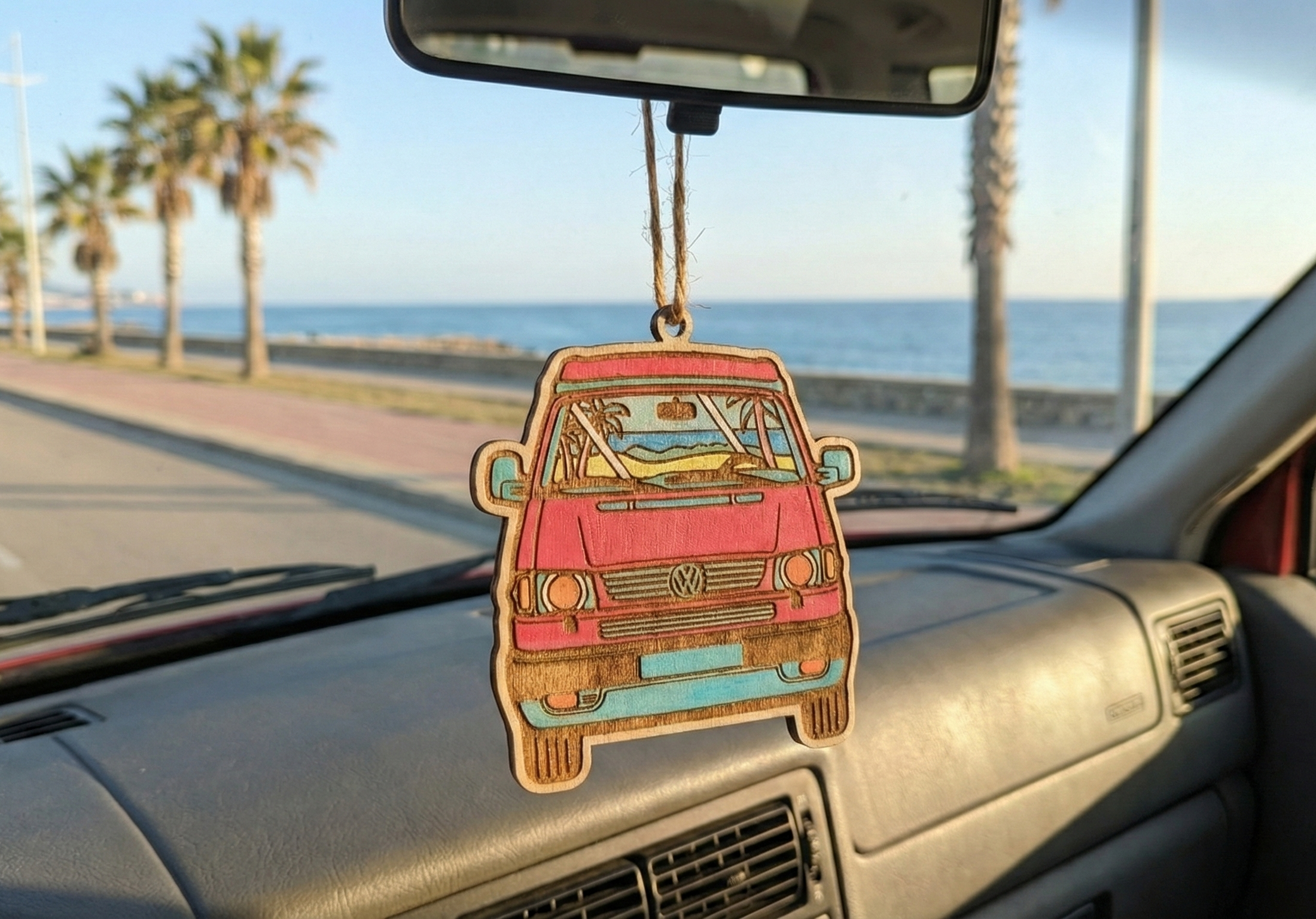 Decora tu furgoneta con este colgador artesanal inspirado en la Volkswagen T4 con techo elevable. Está fabricado en madera de tilo de 3 mm, un material ligero, resistente y con un acabado perfecto para el grabado láser.